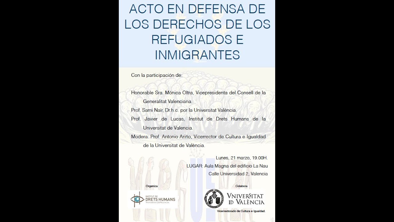La vicepresidenta del Gobierno Valenciano, Monica Oltra, el politólogo Sami Naïr y el catedrático de Filosofía del Derecho Javier de Lucas participan en este acto que se celebra a las 19 horas en La Nau, el edificio histórico de la Universitat de València. El acto, que ha sido organizado por el Instituto de Derechos Humanos de la Universitat de València (IDH), estará moderado por el profesor Antonio Ariño, catedrático de Sociología y vicerrector de Cultura e Igualdad.